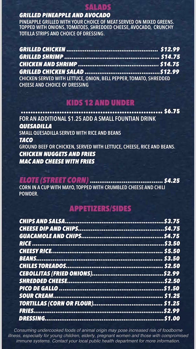 Pineapple grilled with your choice of meat served on lettuce, topped with onions, tomatoes, shredded cheese, avocado, crunchy tortilla strips and choice of dressing.